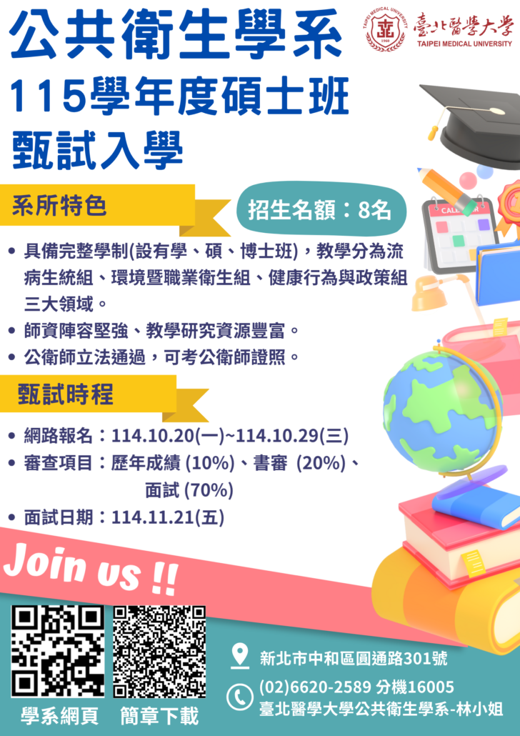 115學年度公共衛生學系碩士班甄試入學海報及重要日程公告2025-10-17/在: 招生訊息, 系所公告 /通過: fangyu臺北醫學大學公共衛生學系碩士班甄試入學資訊如下 網路報名: 114.10.20(週一)09:00起~114.10.29(週三)18:00止(最後取得虛擬轉帳帳號時間為114.10.29(週三)15:00止) 報名方式: 一律採網路報名(網路填表並上傳報名相關資料,報名流程請詳閱招生簡章說明),恕不受理現場報名。 自行下載甄試報到單: 114.11.17(週一) 面試日期: 114.11.21(週五) 放榜日期: 114.11.28(週五) 報名系統將於114.10.20開放上午09:00開放 碩士班甄試入學報名網址: 請至招生組首頁點選『報名系統』→點選『碩士班甄試入學考試』 Post Views: 80 /wp-content/uploads/2022/07/校徽logo.png 0 0 fangyu /wp-content/uploads/2022/07/校徽logo.png fangyu2025-10-17 14:32:102025-10-27 09:36:34115學年度公共衛生學系碩士班甄試入學海報及重要日程公告